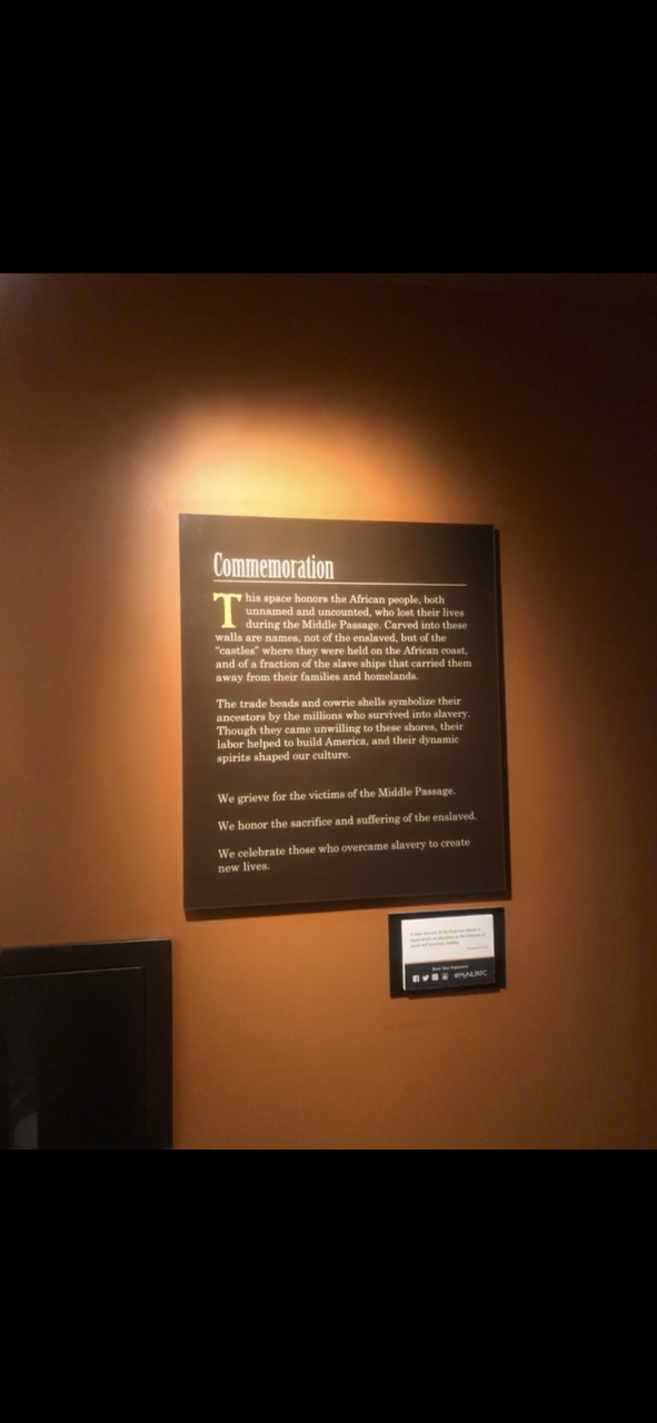 This commemoration space honestly made me feel emotional. I think it can be easy to read about the history of slavery, but separate oneself from it emotionally. This space made me feel many different emotions, but I mostly felt sad. It is heartbreaking that so many innocent lives were lost due to slavery.